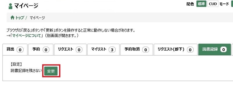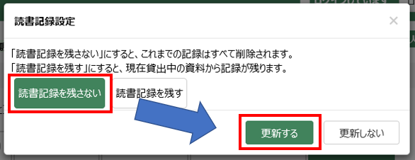 - 初期設定は「読書記録を残さない」になっています。「変更」ボタンを押し、読書記録設定画面で「読書記録を残す」を選択した後、「更新する」ボタンを押してください。「読書記録を残す」にした時点で借りている資料から記録されます。