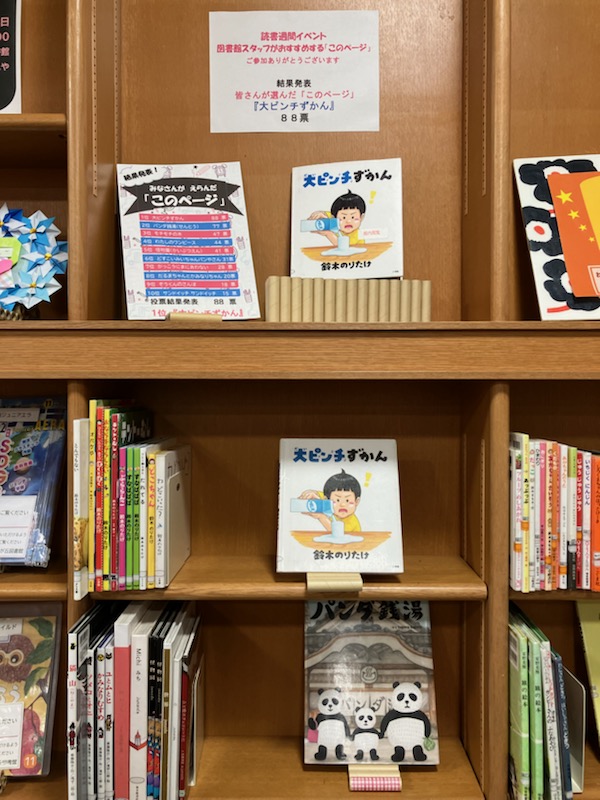 緑が丘図書館では、前年度好評だった「ネタバレ注意!図書館スタッフがすすめるこのページ」の第2弾を開催しました。イベント開始後すぐに多くの方々が展示スペースに集まり、親子や友達同士で見開きページを見ながら、投票を行う姿が見られました。投票結果は、1位『大ピンチずかん』88票、2位『パンダ銭湯』77票、3位『モチモチの木』47票、総投票数は409票でした。