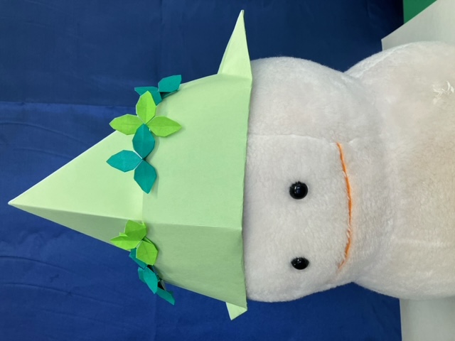あいにくの雨でしたが10名のお子さんが参加し、大型絵本の読み聞かせや手拍子、手遊びを楽しみました。画用紙で作ったとんがり帽子をプレゼントし、帽子に付けて貰う飾りを何点か用意すると、飾りを自由に付け嬉しそうにしていました。