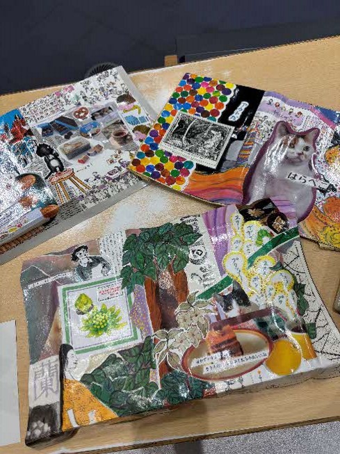 廃棄本から切り取った素材を、台紙に貼って自分だけのブックカバー作りを体験しました。アンケートの「またやりたいですか?」という項目に対し、参加者14名全員が「はい」と回答して下さいました!イベント終了後は、ブックカバーを広げながら嬉しそうな顔をしている子どもたちを多く見かけました。