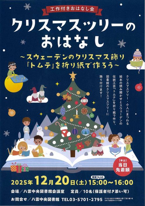 クリスマス飾り『トムテ』の折り紙工作とクリスマスツリー・小人に関連した絵本の読み聞かせを行います。ぜひ、お子さんと一緒にご参加ください。